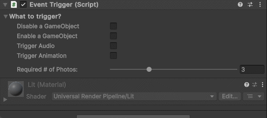 Other actions that the EvidenceObject script performs is marking other similar objects as old as well, defined by a list in Unity’s inspector. An evidence check-off list can also be found in the pause menu and the EvidenceObject script adds a checkmark / cross-out to this list based on an evidence ID number.